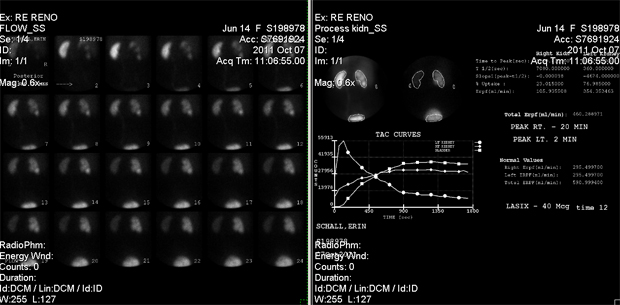 On the scan, my doctor saw that my right kidney looked smaller and my left one looked bigger. She decided to send the scans to a urologist. The urologist figured out what was going on pretty quickly and sent me to have a nuclear medicine test. In this test, they shoot nuclear poison stuff into your vein and you can watch how fast your body moves it through your system. Krueger (right kidney) didn’t do so well. In the renogram below, you can see that the poison is filling up really fast at the right kidney (on the left side as the camera was taken from under my body)  and that left kidney finally just takes most of it eventually.